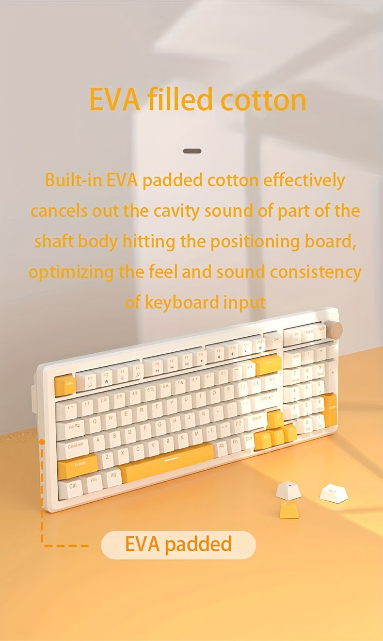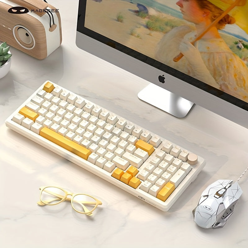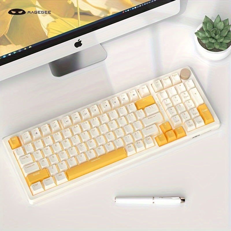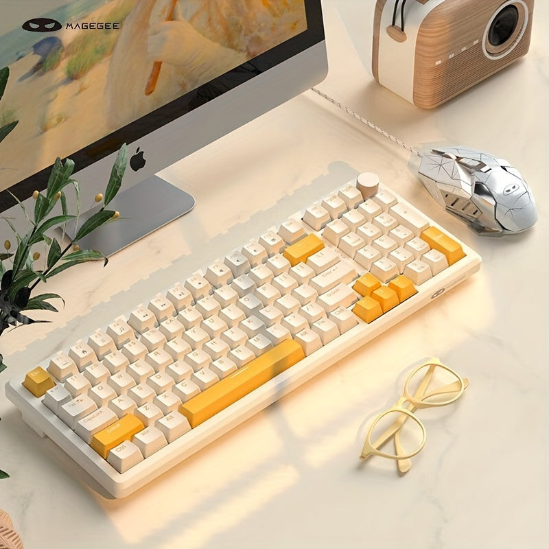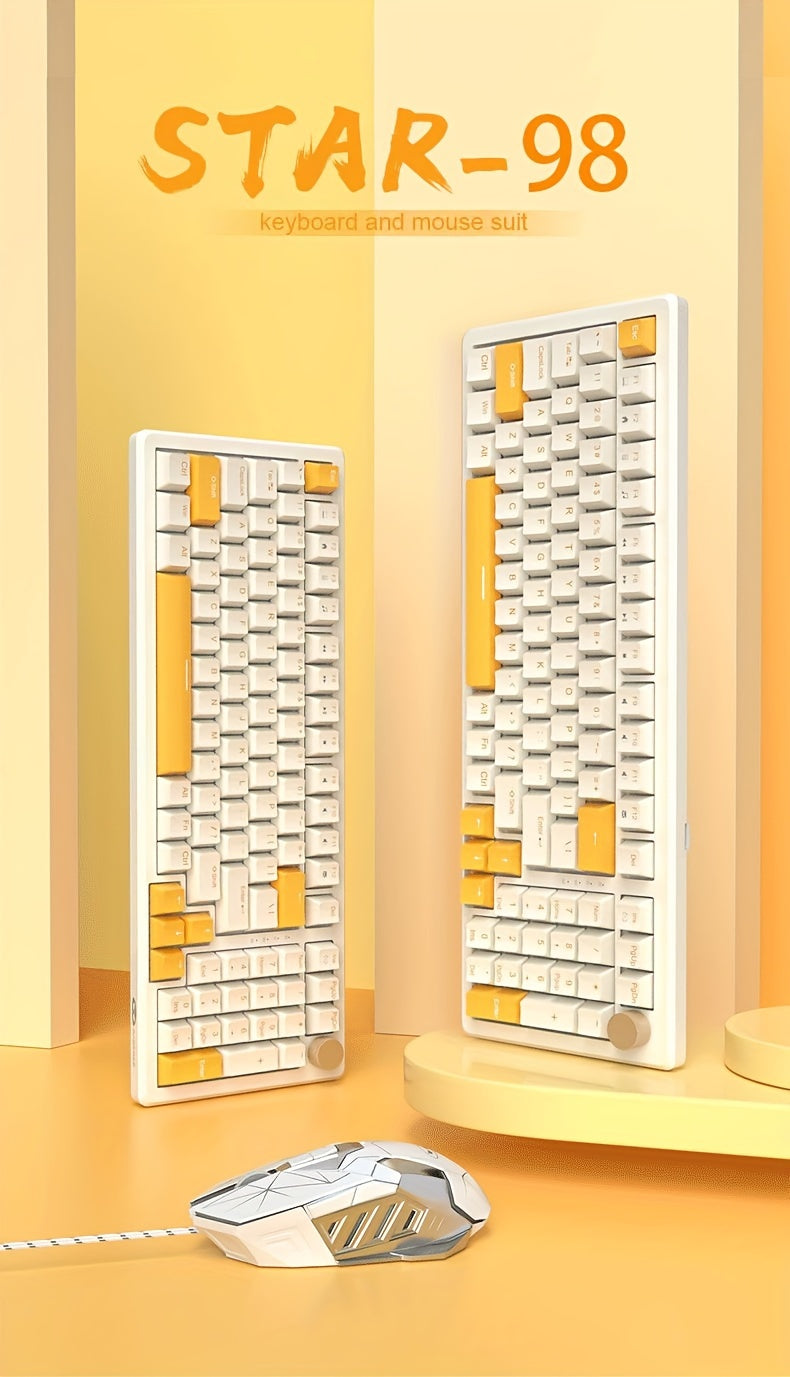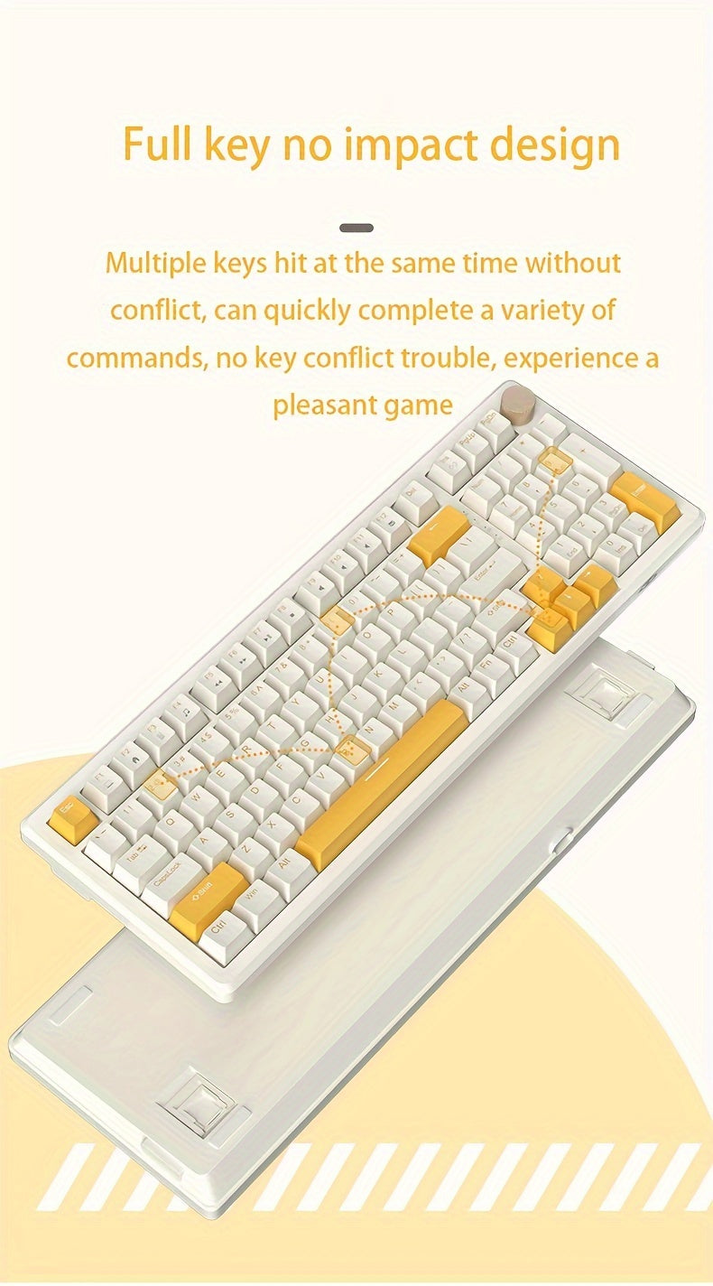 • High-Quality Practical Design: This keyboard has 98 anti-ghosting keys, a durable metal panel, and a stylish white and yellow design. It also includes 16 extra yellow keycaps, low-profile ergonomic double-shot keycaps, and dual adjustable kickstands.