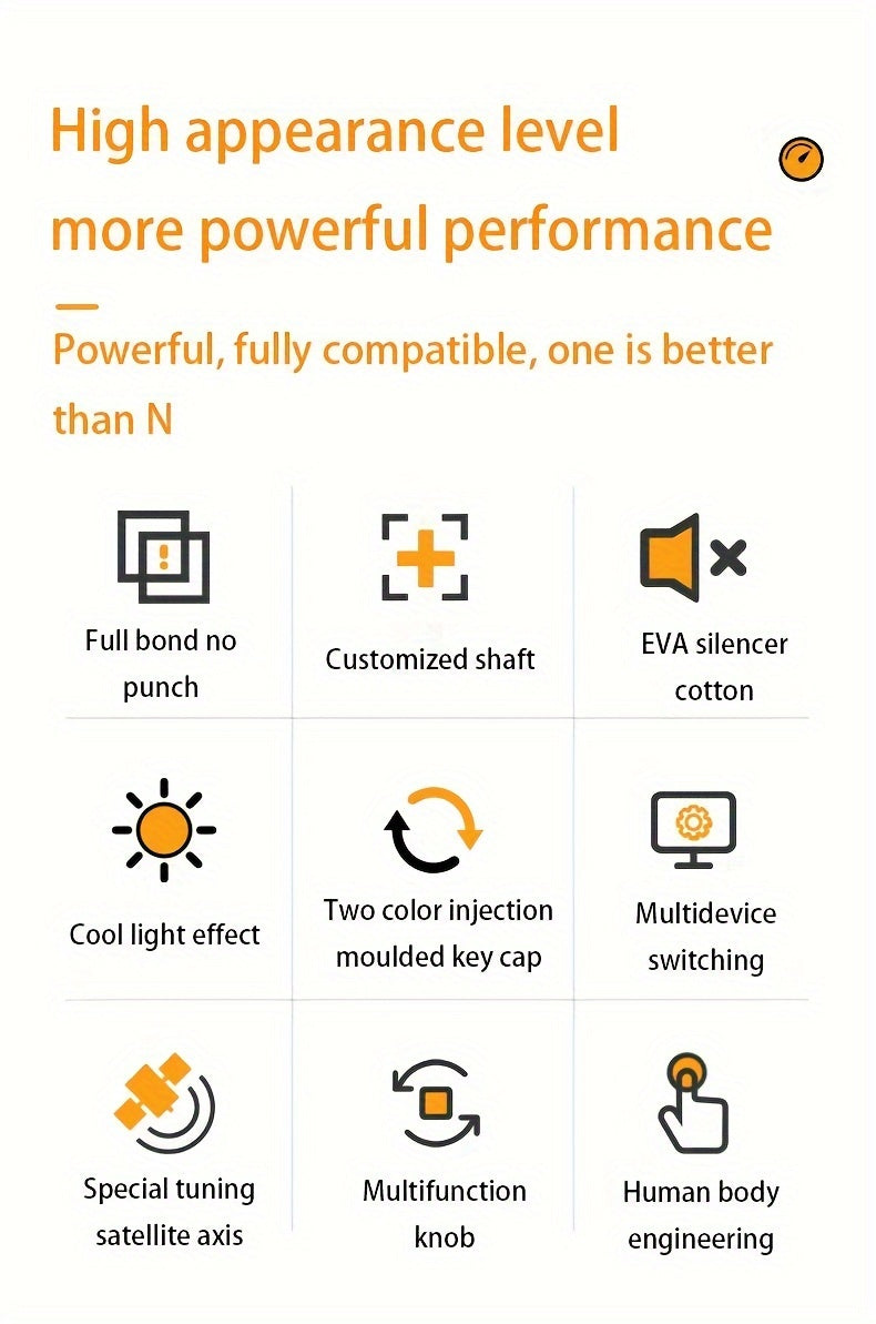• Vibrant Yellow LED Backlight: Featuring customizable lighting effects with approximately 16 backlight modes, including both static and dynamic options for a cool visual experience. Easily switch lighting effects with Fn + Ins, and adjust brightness and speed with Fn + ↑ ↓ ← → keys.